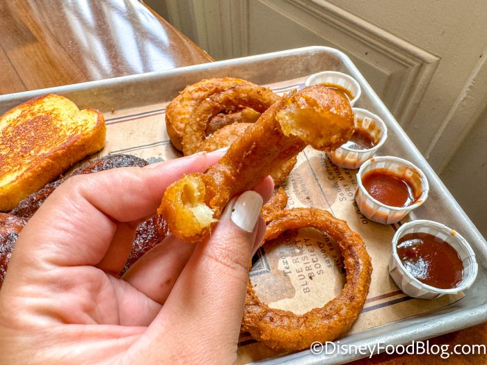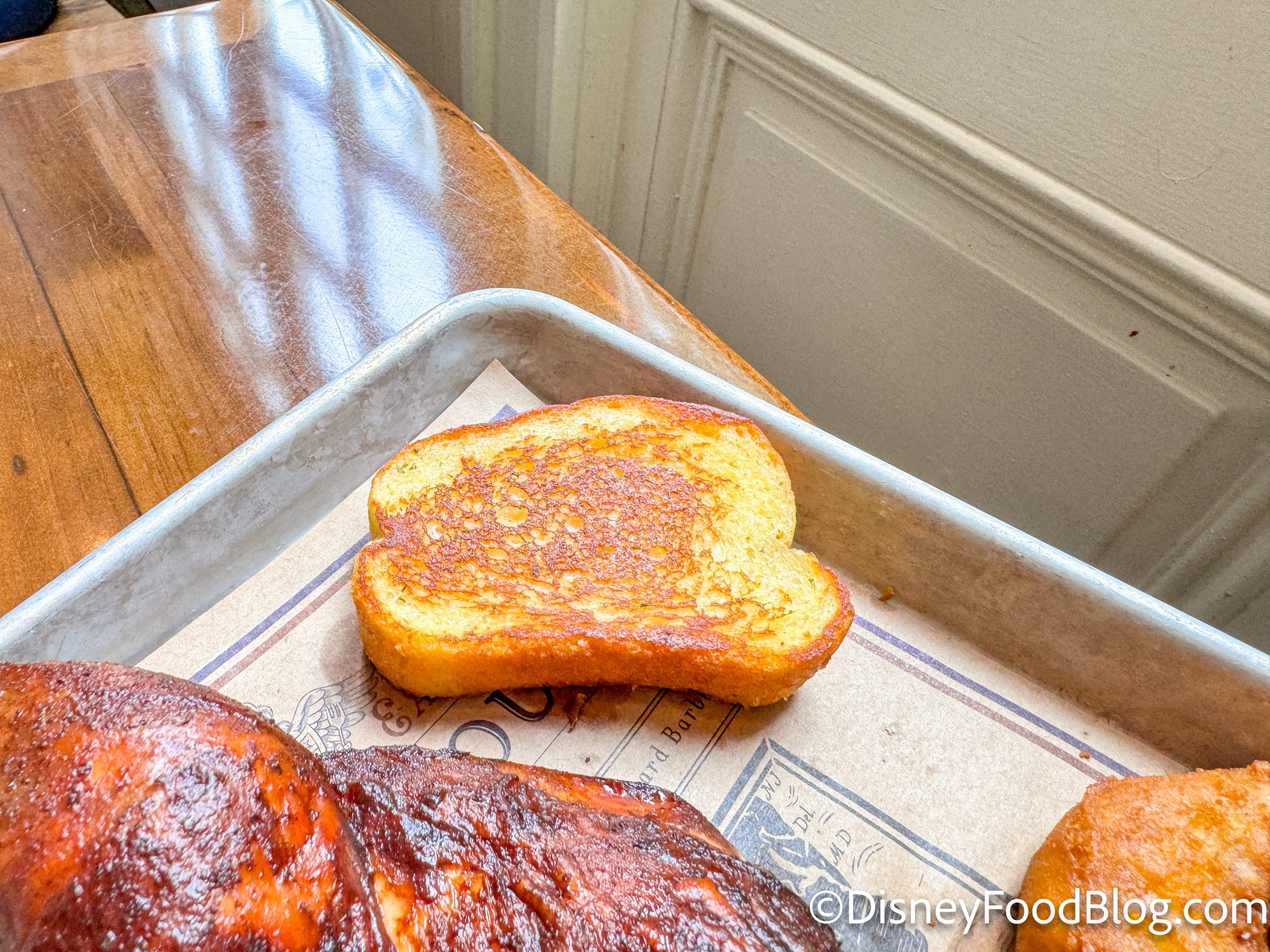 Last but not least, let’s talk about that Kansas City Smoked Half Chicken for $14.79. This comes with a slow-smoked half chicken with sweet barbecue sauce served with one side and a piece of garlic toast. Disney notes that due to their unique smoking process, your meat may appear pink in color, so don’t be alarmed if that’s the case!