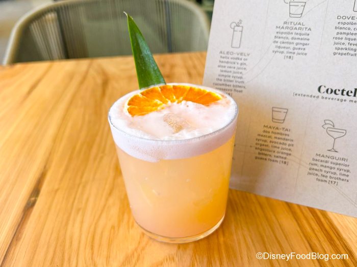 Of course, you can pair that brunch with a delicious signature cocktail, like the Maya Tai, made with dos hombres mezcal, mandarin syrup, avocado pit orgeat, lime juice, angostura orange bitters, and salted guava foam. We loved how refreshing this drink was!