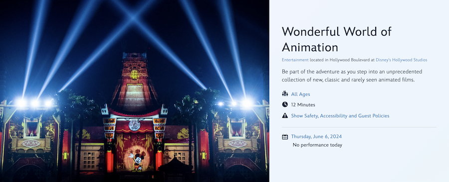 First up, there’s Wonderful World of Animation. The nighttime show is described by Disney as featuring “spectacular sequences celebrating themes like magic, family, adventure, romance, and friendship. Each theme is brought to life through unforgettable moments from beloved films—like Sleeping Beauty, The Incredibles, Coco, and many more” projected onto the Chinese Theater facade. But, currently, it has no shows scheduled through June 6th.
