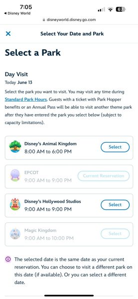 We theorized that perhaps many Passholders who had been able to book a Magic Kingdom Park Pass for the 13th did so without being sure if they could get out to the park today, and perhaps were unable/unwilling to join the queue at 7:00AM. Interestingly, despite the virtual queue not being full, we were unable to modify a Park Pass from EPCOT to Magic Kingdom.