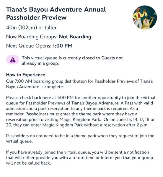 Disney World Annual Passholders have the opportunity to preview Tiana’s Bayou Adventure on June 13th, 14th, 16th, 17th, 18th, and 20th! Annual Passholders need a park reservation at Magic Kingdom on one of the preview dates to have the opportunity to join the 7AM virtual queue — or, make a park reservation at any of the parks to have the opportunity to join the 1PM virtual queue.
