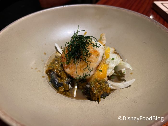 It’s a seared scallop with sumac-roasted pork belly, corn cream, mustard caviar, and fennel crisp.