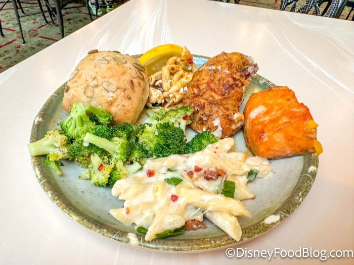 When things swapped over for lunchtime, Disney rolled out an entirely new buffet! Starting things off with the kids’ section, we’ve got chicken tenders, mac and cheese, mini beef quesadillas, and cheesy pizza bread.