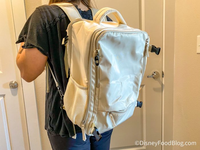 If we’re flying to Disney World instead of driving, we try to just bring a carry-on bag rather than a suitcase that we’d need to check. That way, we don’t have to wait for our suitcases after disembarking the plane, and there’s no worrying about lost luggage. One of our favorite carry-on bags is this $34 backpack from Amazon!