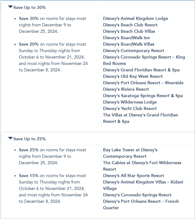 With this deal, you can save up to 30% on hotel rooms most nights from November 24th to December 25th, 2024. Only certain dates will allow you to take advantage of the highest discount, but there are lots of hotels and dates included in this deal! Additionally, you can save up to 20% on most Sunday to Thursday nights from October 6th to November 21st, 2024. These are some great times to take part in the holiday festivities including Halloween and Christmas.