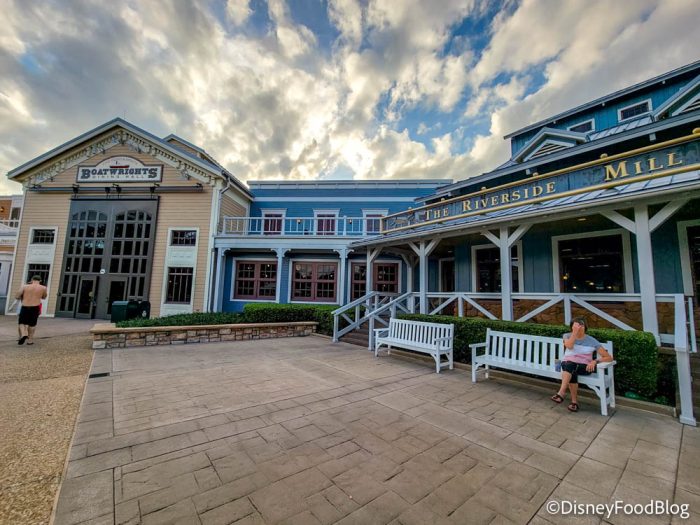 Riverside Mill is located at Port Orleans Resort — Riverside, and you can enter through the hallway from the lobby, or from outside the main building of the resort.