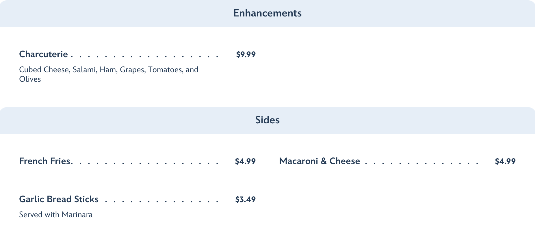 Need a side to go with your meal? Check out the charcuterie, french fries, bread sticks, or macaroni and cheese.