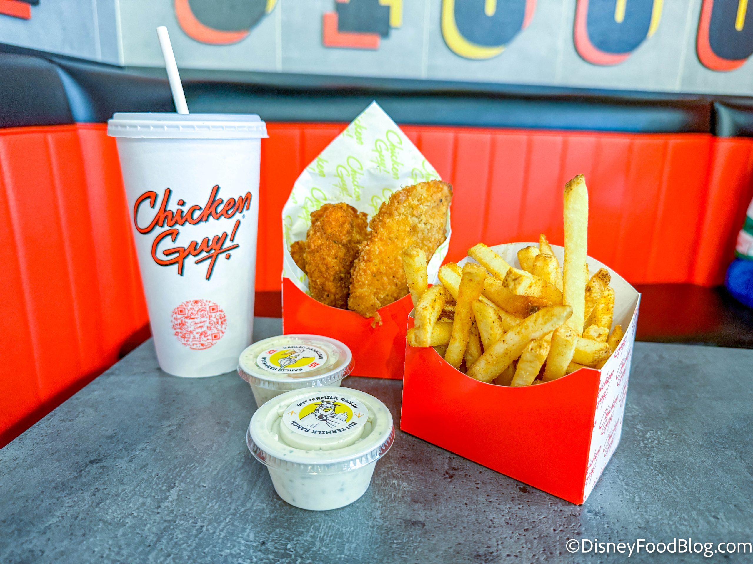 Chicken Guy! — headed by Guy Fieri and restauranteur Robert Earl — has its Flagship location in Disney Springs. The menu puts the spotlight on fresh, all-natural Chicken Tenders paired with a variety of sauces. The tenders are “hand-pounded to maximize crunch,” and brined in lemon juice, pickle brine, and buttermilk, and infused with herbs. Sandwiches, salad bowls, mac-and-cheese, frozen treats, and more are also on offer.