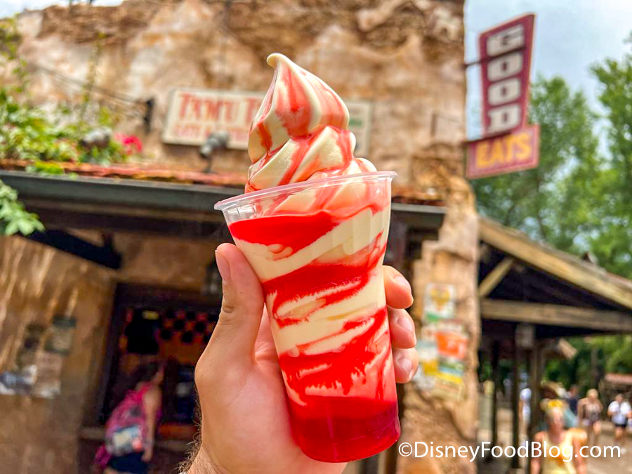 Over in Disney’s Animal Kingdom, you used to be able to grab the Simba Sunset at Tamu Tamu Refreshments, which was another favorite. This is Pineapple Dole Whip topped with a red syrup flavored with strawberry, watermelon, and coconut, and there was an alcoholic version available as well! (Please bring it back, Disney!)