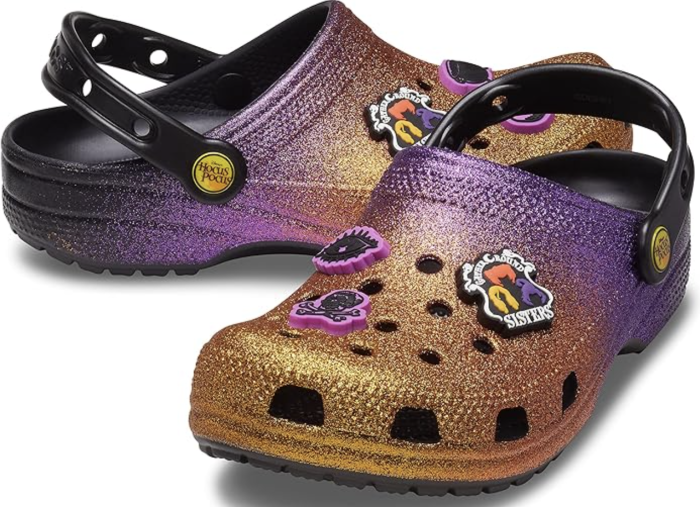 But wait — there’s another Halloween-themed option on Amazon, too! These Hocus Pocus Crocs have a black base and then a sparkly purple-to-gold ombre pattern that fits the theme perfectly. They come with a few themed jibbitz, too, including one that shoes the three sinister sisters’ hairstyles!