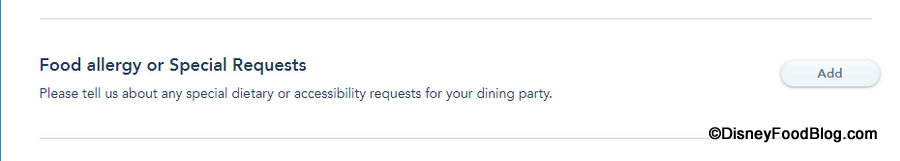If you are making your reservation online via the Walt Disney World website, you will be presented with the option to note a Food Allergy or Special Request as part of the reservation process. When you see the option below, click “Add.”