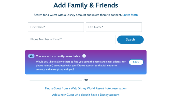 From here, you’ll find the option to “Add a Guest,” and you’ll be prompted with the info you need to fill in, including their name and age, or you can search for someone by their name, phone number, and email address through the app — this will work as long as they’ve chosen to make themselves searchable by choosing the “Allow” option when prompted to allow others to find them.