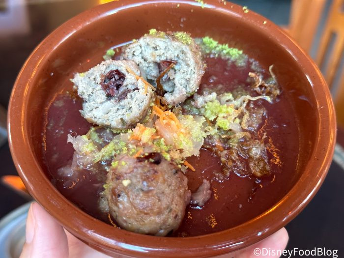 They’re rolled into a meatball consistency, and when you bite into them, it’s like a flavor explosion in your mouth. They’re lightly coated in something sweet like a teriyaki sauce, and we found these to be a delicious tease of the turkey and chicken meat, coupled with the sweet cranberry preserve. Still, we almost missed the crispy sauerkraut unless we were really looking for it underneath the other more prominent flavors.