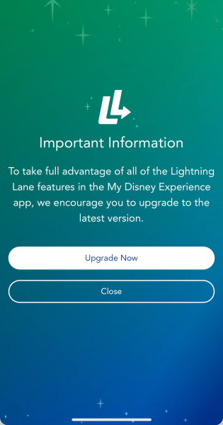 One of the most recent announcements we noticed was on the My Disney Experience app. We received a message on our iPhone that to take advantage of the new Lightning Lane Multi Pass and Lightning Lane Single Pass(which has since gone into effect), we would need to upgrade the app.