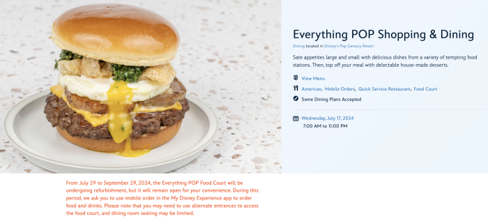 The first warning we’re seeing on the Disney World website is on the page for Disney’s Pop Century Resort. The page for the hotel announces that the Everything Pop Food Court will be undergoing refurbishment from July 29th through September 29th. It also states that the food court will remain open, but that guests at Pop Century will need to use Mobile Order on the My Disney Experience app to order food and drinks.