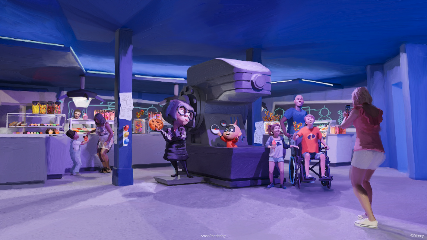 Next up, a new sweet shop has been announced for the Disney Destiny! Edna A La Mode Sweets will transform Edna Mode’s super suit factory into a brand-new and unique confectionery. The shop is inspired by the short film Auntie Edna and will repurpose her sewing equipment into sweet-making devices. You’ll find handmade gelato, ice cream, cookies, candies, and specialty treats in the shop along with statues of Edna and Jack-Jack.