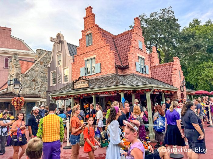 It is not available on mobile order, but they are available while supplies last. Each person can purchase two per transaction. It’s also ONLY available during the Halloween party. Because of that, it was a pretty popular spot last night. Here’s a look at the SUPER long line that appeared last night for the sipper at Sleepy Hollow! The good news is that if you want to get food from here, you CAN get that via mobile order.