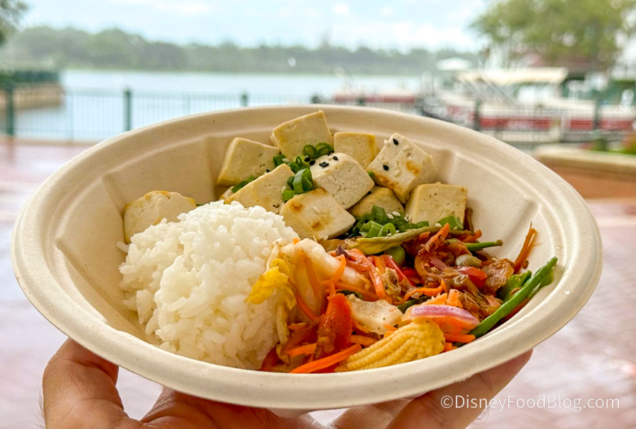 We picked up the Korean BBQ Tofu Bowl from Gasparilla Island Grill recently, so we’re bringing you our full review! This dish is made with Tofu, Korean BBQ Sauce, Lemon-scented Jasmine Rice, and Seasonal Vegetables for $15.79. It kind of sounds similar to our beloved tofu bowls from Satu’li Canteen at Animal Kingdom — but how does it compare?!