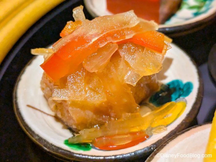 We loved the spinach and shiitake with tofu paste. It’s almost like a bite of cold stewed veggies with a peanut sauce on top (although it’s actually a tofu paste, but it still tastes a bit nutty).