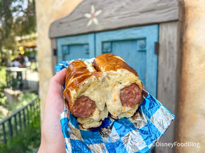 We stopped by Edelweiss Snacks in Fantasyland to try the new Fantasyland Garlic Cheesy Brat. This is a bratwurst in a cheesy garlic pretzel bread, and it looked and smelled amazing! You can grab this large brat for $12.99.