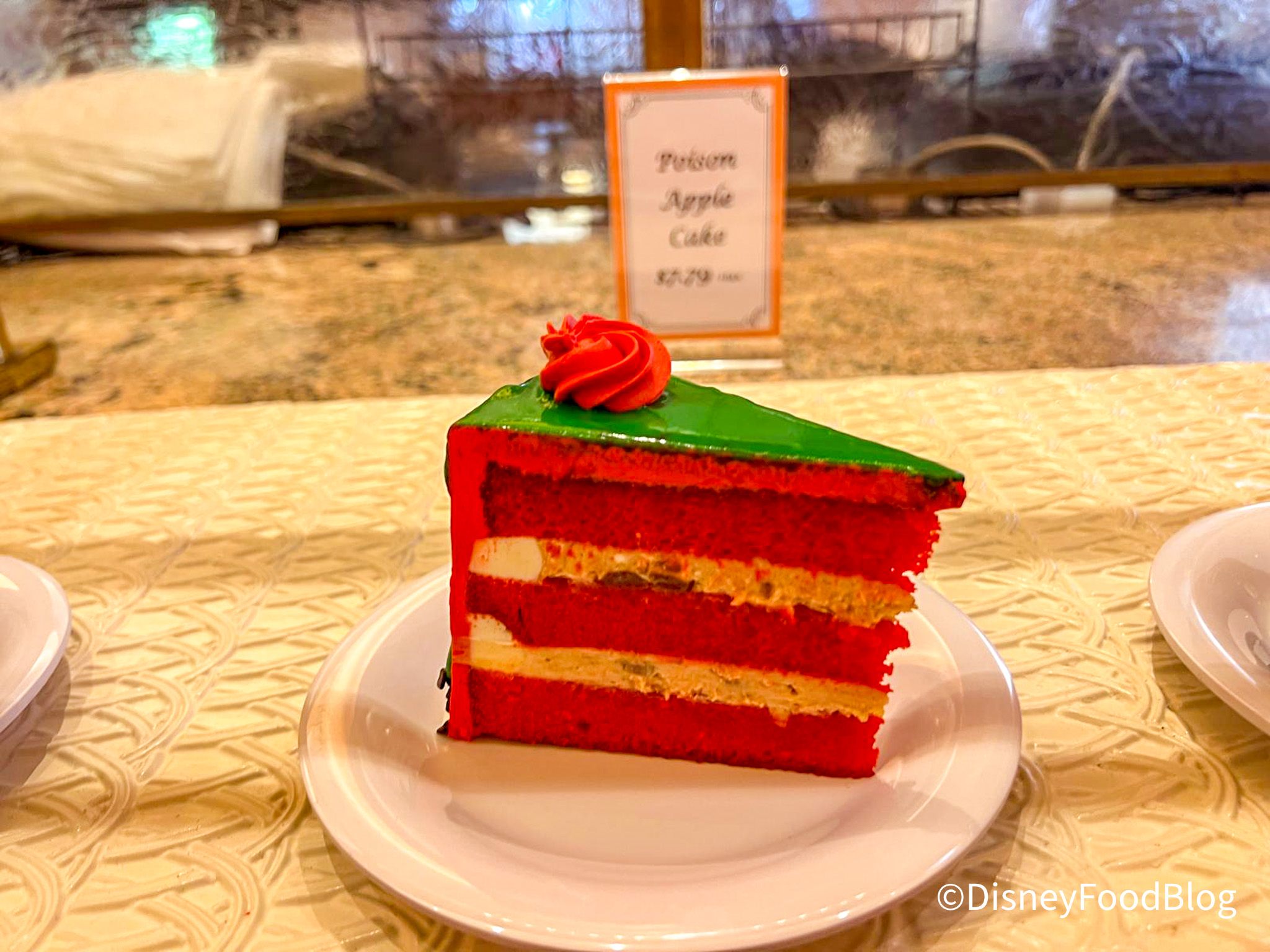 Our last snack in Disneyland Park was the new Poison Apple Cake at the Plaza Inn. It’s a red cinnamon cake with cream cheese and caramelized apple filling, red cream cheese frosting, and a green ganache. You can grab a slice during lunch or dinner for $7.79.