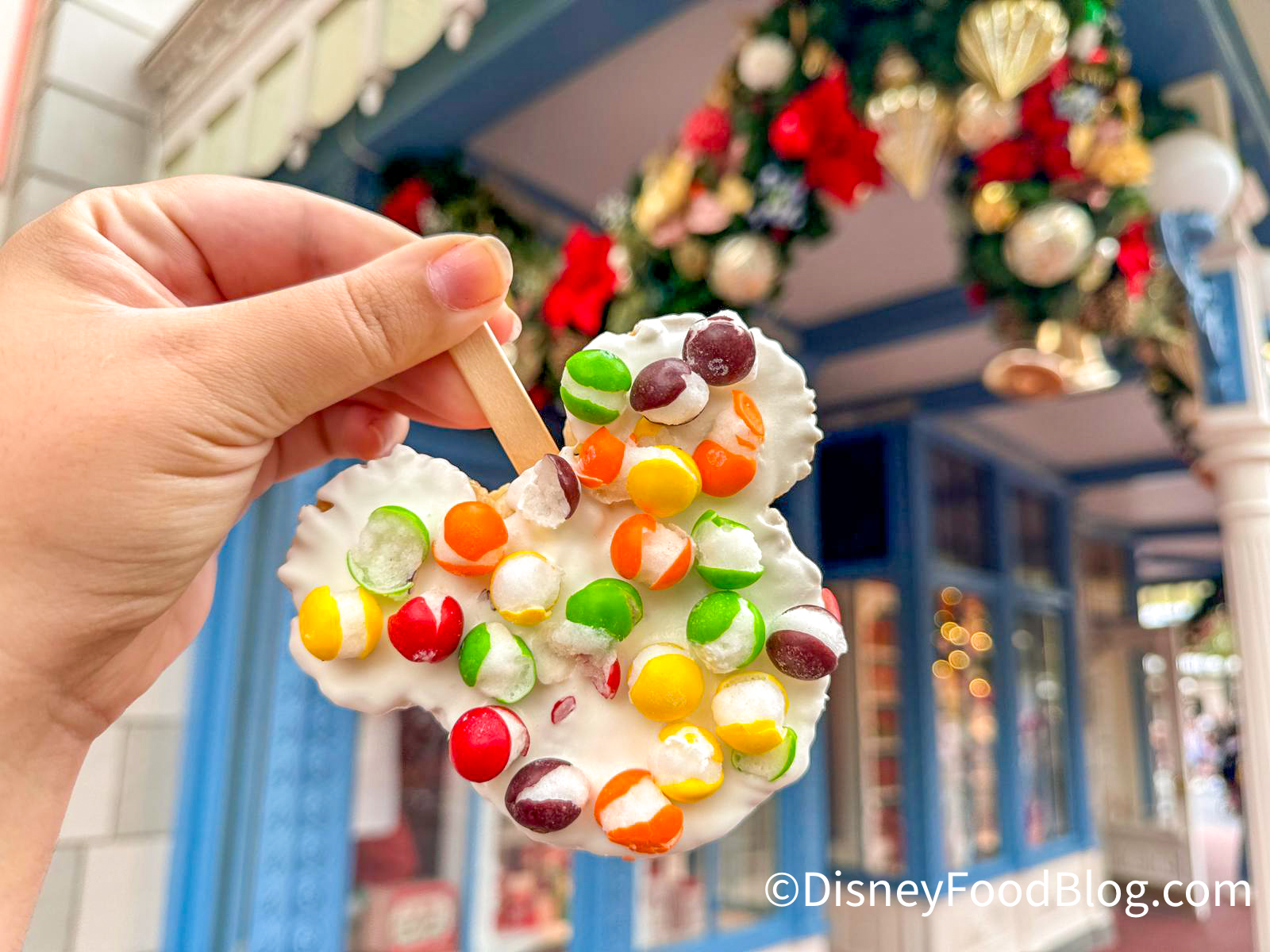 Okay, Disney is suddenly OBSESSED with putting freeze-dried Skittles on everything, and we’re not sure why. Maybe there’s a kid in charge of the menu or something…who knows? Anyway, the Mickey Crispy Treat dipped in white chocolate with freeze dried Skittles was a HUGE mistake.