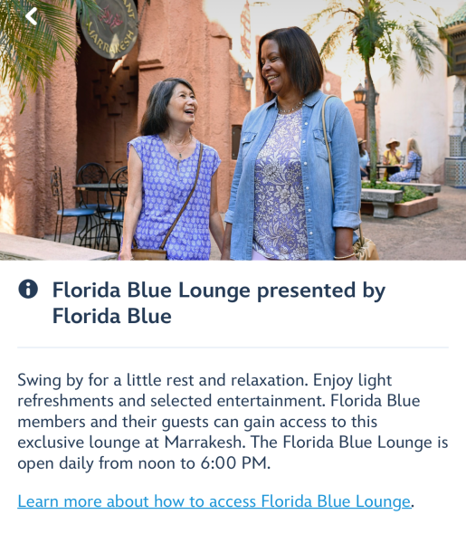 Now the Florida Blue Medicare Lounge is open to everyone, but you do have to register if you want to enter. There are a couple of way to register. The first is you can search for Florida Blue Lounge in the My Disney Experience app which will direct you to their site.