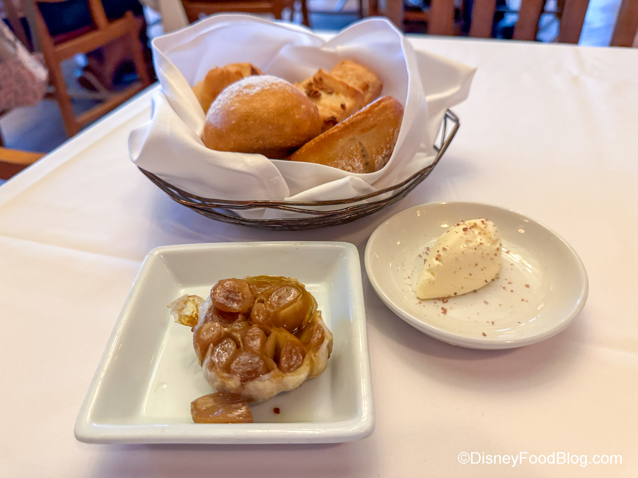 The complimentary bread service is one of our favorites at Disney World. Although it’s not flashy, the yeast rolls and flaky onion rolls are delicious and served with garlic confit and salted butter.