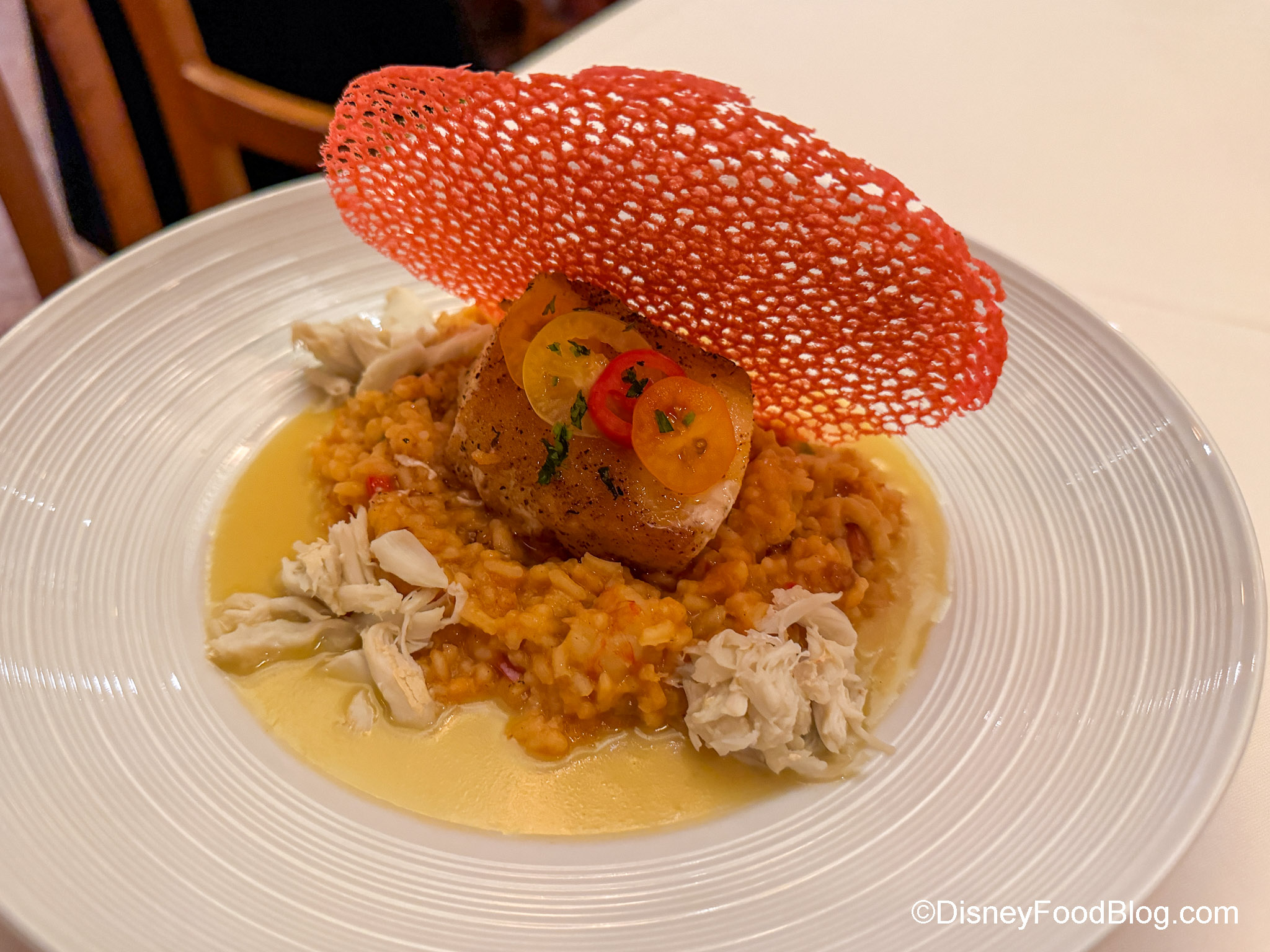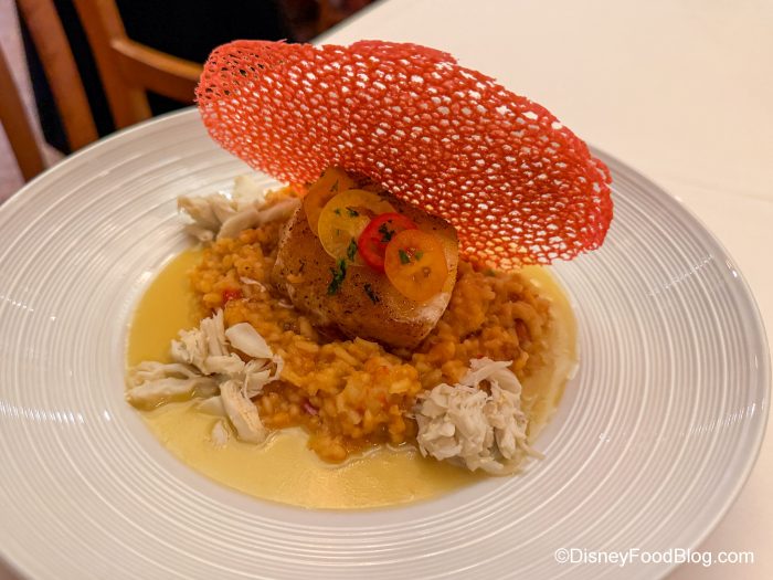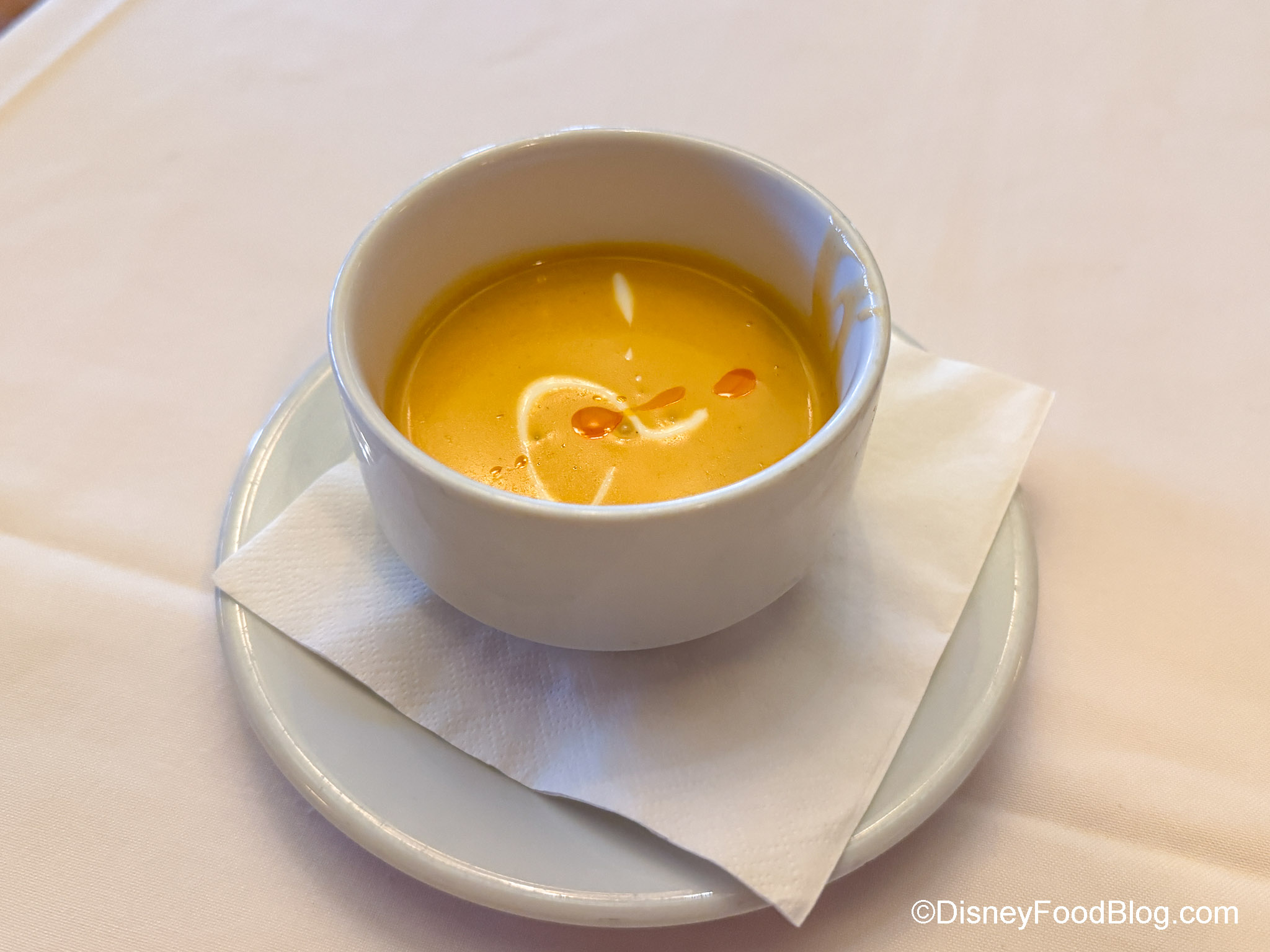 For our appetizer, we ordered the Lobster Bisque for $18 made with Lobster Biscuit, Crème Fraîche, and Espelette Oil. This is one the best soups we’ve had in Disney World, and that’s counting the lobster bisque we recently had at Narcoossee’s. It’s so creamy and buttery, with just the right amount of lobster, without tasting overtly fishy. It’s decadent enough to split, too (which we did, so the photo below is a half portion). We’re glad the server warned us of how rich this soup is because we would have filled up on this alone because it’s so good.