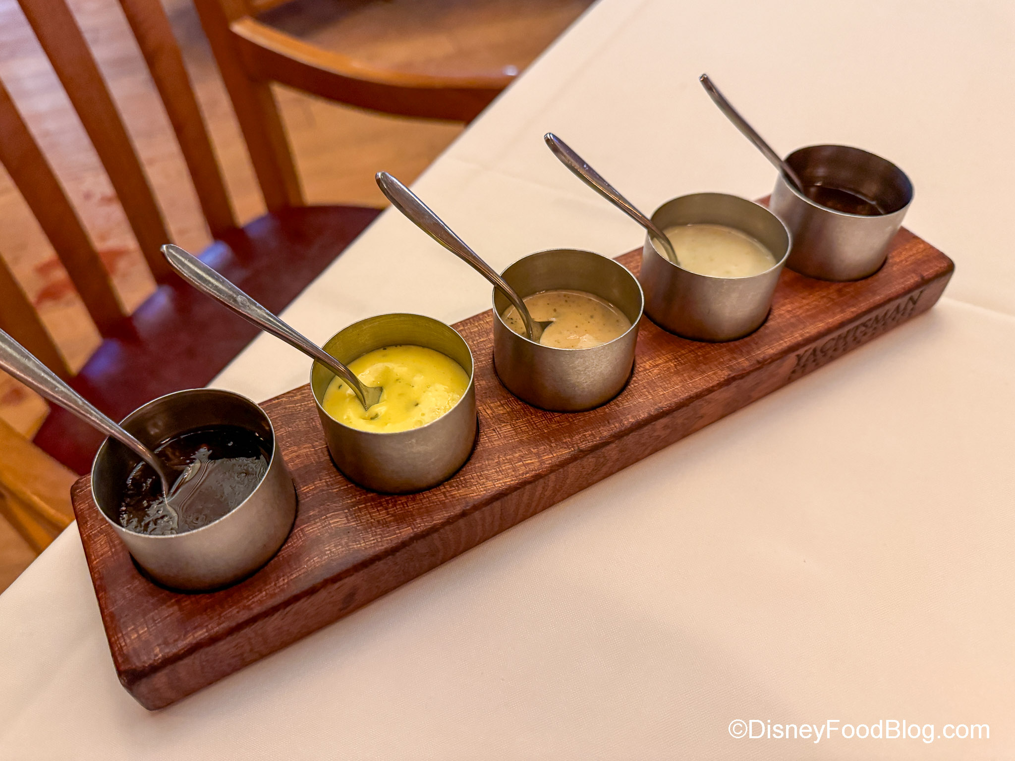 You’ll see that Yachtsman Steakhouse is a traditional restaurant in that the menu screams “classic steakhouse.” You can grab a variety of First Course options like soups and salads. Of course, this is a steakhouse, so if you’re here for steak (as you should be), you’ll find the Butcher Cuts or one of the Chef’s Signature items. You can also add to your entree with a Butcher’s Cut Enhancement. You can also get a Sauce Flight — say WHAT? If you want chicken or fish, that’s also an option, as well as a variety of side items and desserts.
