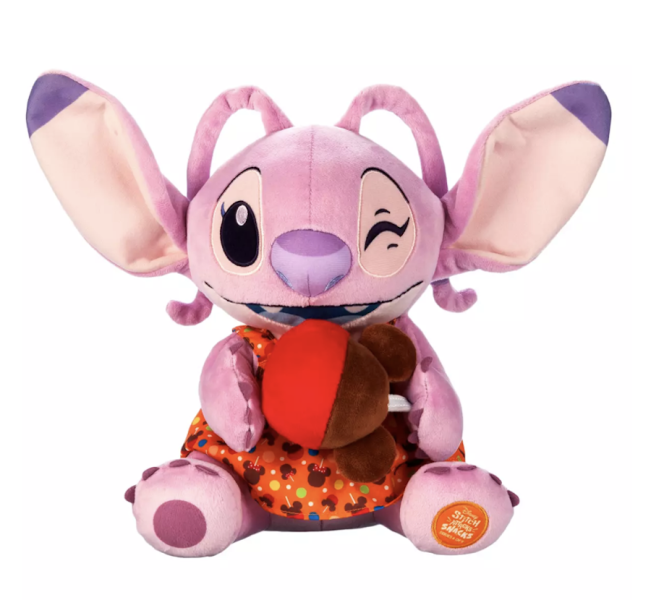 Stitch’s sweetheart — wearing a matching jumper to her alien beau — also seems to be loving her candy apple. Both plushes have an embroidered ”Stitch Attacks Snacks” patch on her foot.