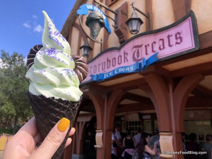 The Maleficent Waffle Cone first debuted in Disney World at the 2018 Mickey’s Not-So-Scary Halloween Party where it was made with a lime soft-service ice cream. It then made a comeback at Storybook Treats for the return of the Maleficent Dragon Float for the Festival of Fantasy Parade in 2019. Now, it has returned again for Halloween at another popular Disney World ice cream shop in Disney Springs, but this time it has a surprising twist!