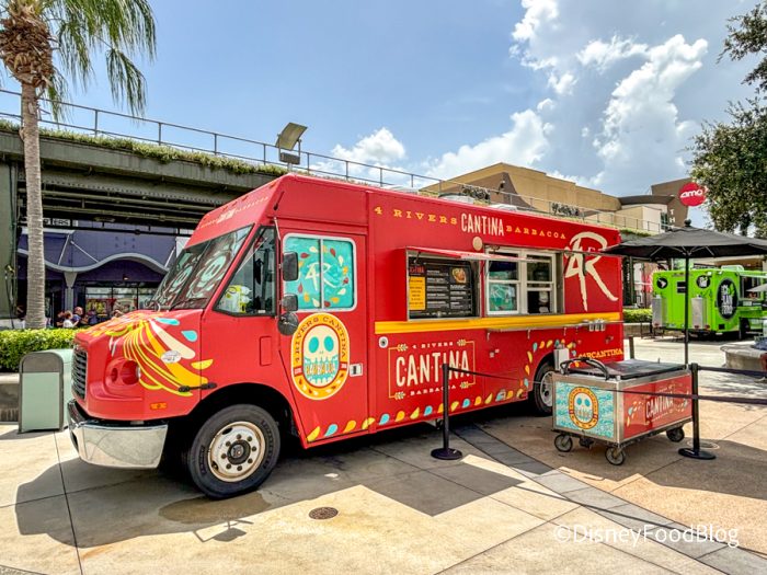The 4 Rivers Cantina Barbacoa Food Truck is located on the West Side of Disney Springs. It is in an area with a selection of food trucks across from Disney’s Candy Cauldron. When we were there you could find a total of three food trucks: 4 Rivers Cantina Barbacoa, Cilantro Urban Eatery, and GoJuice.