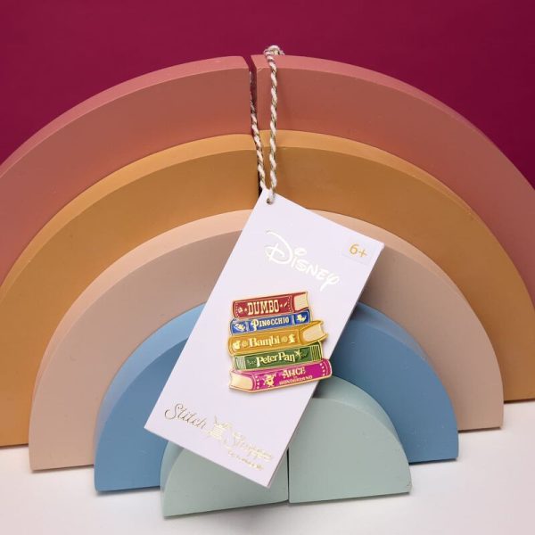 This whimsical Loungefly crossbody bag is designed to look like a stack of books, with the titles on the spines in gold metallic. The tiles include some Disney classics such as Dumbo, Pinocchio, Bambi, Peter Pan, and Alice in Wonderland.