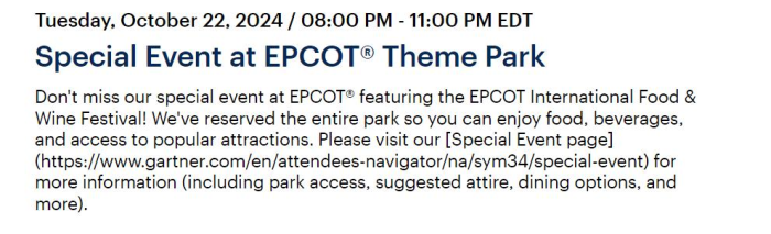 The park typically closes at 9PM…so what gives? Well, we did some digging and found that it’s because a company has bought out the park for the evening! The Gartner Group has bought out EPCOT for the evening to have their IT SYMPOSIUM|Xpo from 8-11PM. That means all attractions and restaurants in EPCOT will close for guests at 5PM (but, as usual, if you get in line for a ride before 5PM, they’ll allow you to ride), giving the park time to empty out before the event members come in a few hours later.