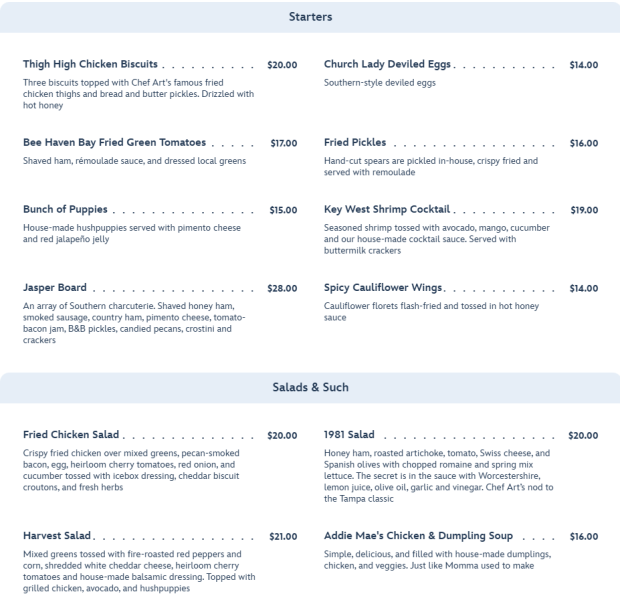 Chef Art Smith’s Homecomin’ just added SEVEN new eats and drinks to their menu, so you know we had to go and check some of them out! The following items joined the menu on August 28th, 2024: Meatloaf Main Plate, 1981 Salad, Smothered Chicken, Meatloaf Sandwich, The Honeybee, Cowboy Colada, and Dragon Fruit Mojito. The restaurant boasts a large menu full of dishes inspired by Florida’s freshest flavors and lots of Southern comfort. You can choose from a variety of starters and salads, including the new 1981 Salad.