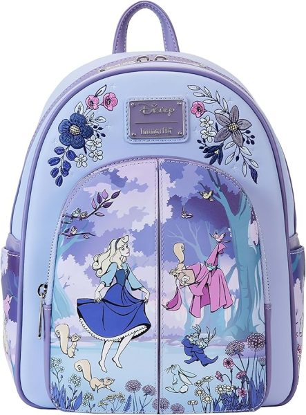 This beautiful Sleeping Beauty 65th Anniversary Loungefly Backpack features not only Aurora herself, but one of the most iconic scenes from the film with all the woodland creatures. But if you open up the front panel, you’ll see Aurora dancing with her prince!