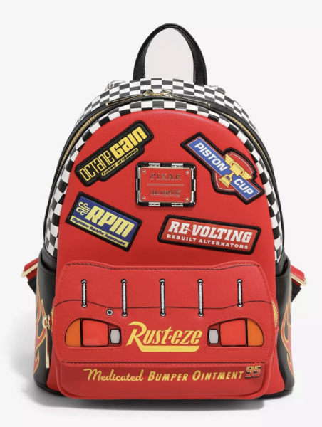This bag features a design reminiscent of Lightning McQueen’s bumper, complete with bumper stickers and ads for products from the Cars universes, including the iconic Rust-eze. The design also features a checkered flag pattern and flames. And if that wasn’t enough…