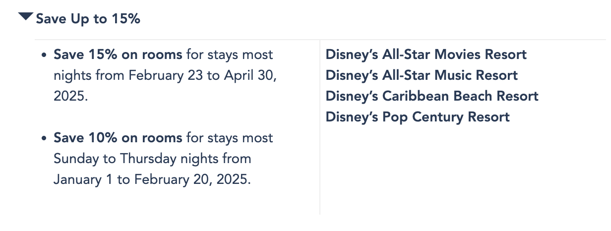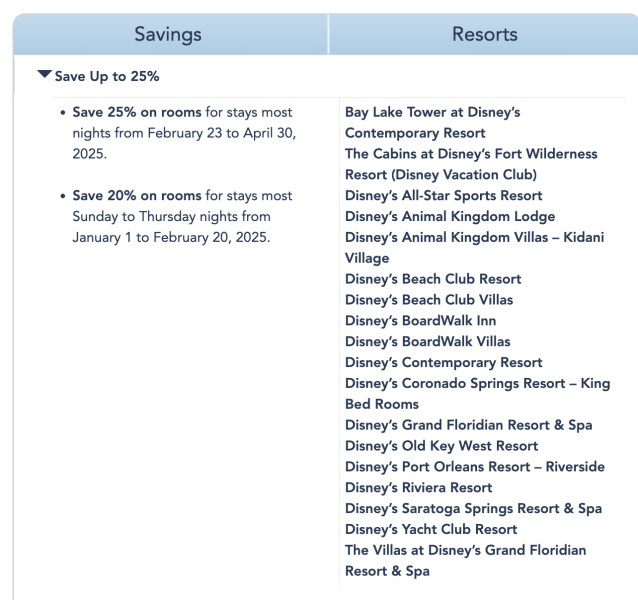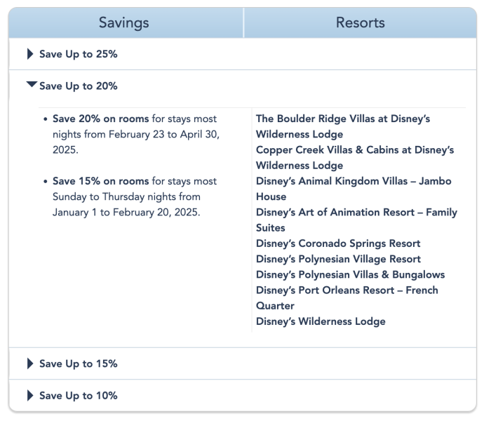Then, after that, the discount varies depending on the hotel that you choose. Here’s the list that includes 25% or 20% savings depending on the dates you stay: