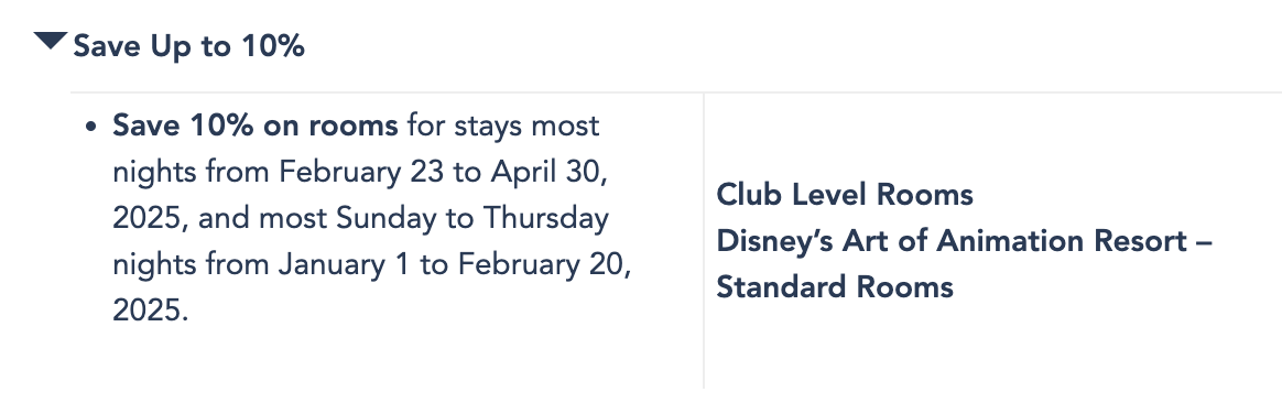 If you want to stay at Disney’s Art of Animation in the Club Level Rooms, you can score 10% off your stay in early 2025.