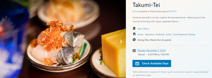 Takumi-Tei, in the Japan Pavilion in EPCOT’s World Showcase, closed with Disney World in 2020 and didn’t reopen until 2022. After its reopening, though, its hours remained limited to Thursday through Mondays, meaning it was closed on Tuesdays and Wednesdays.
