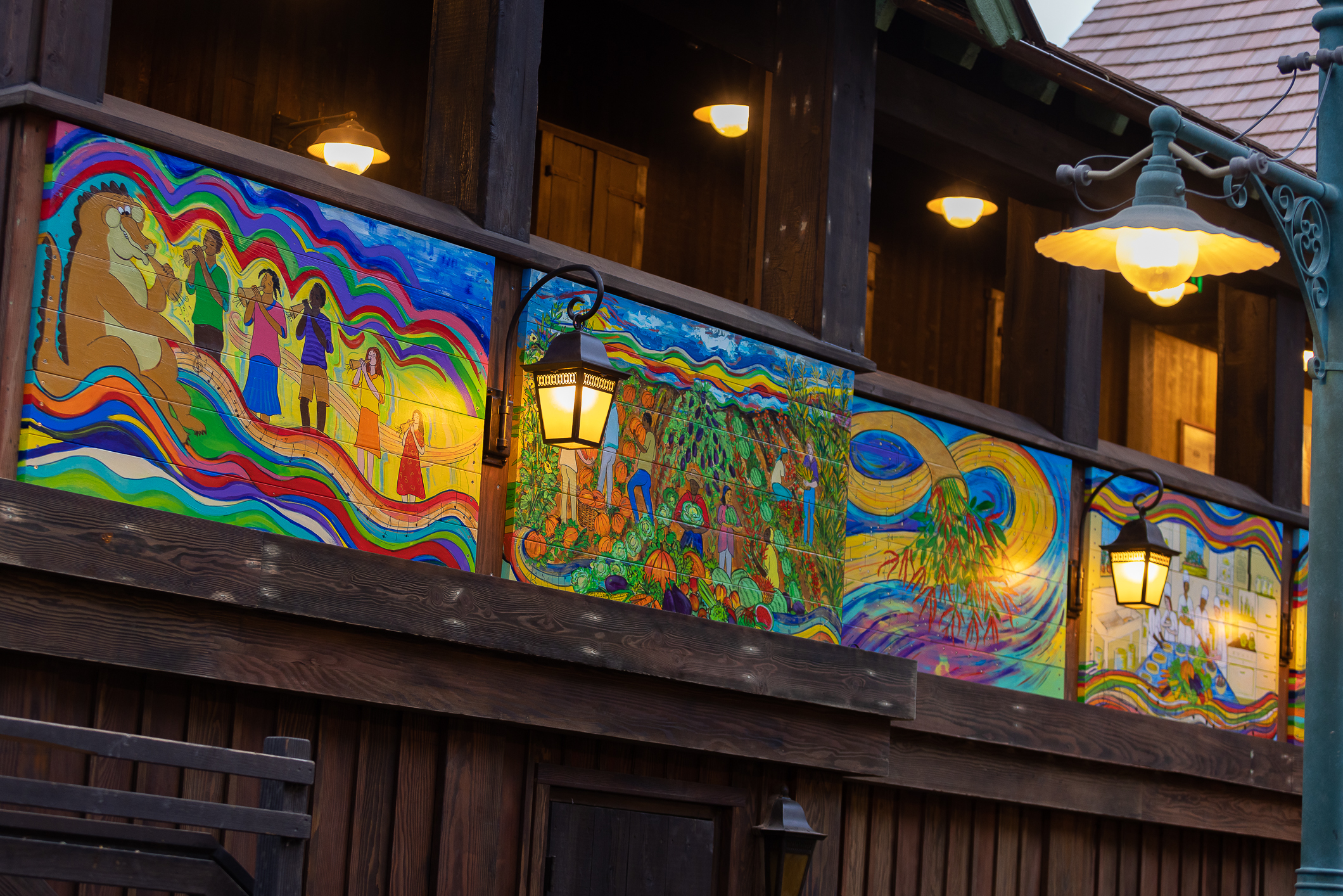 In the queue area, colorful new artwork has been added that features characters and scenes from the attraction. We spot Louis playing jazz with the big boys!