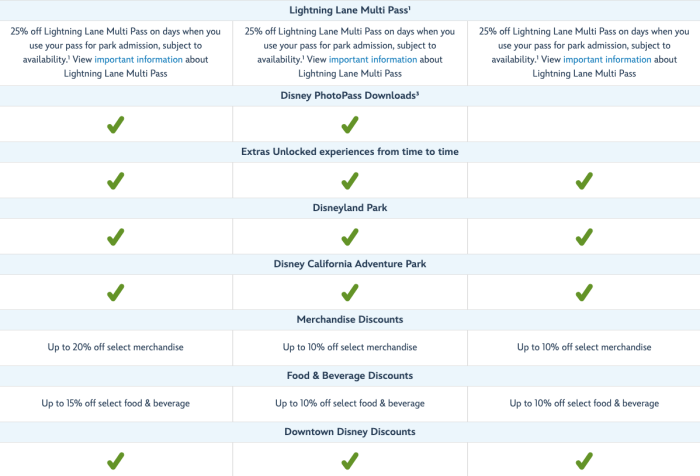 Below, you can see some of the differences between the Annual Passes. Note that Inspire Keyholders get a higher merchandise discount, free standard parking, and up to 15% off food and beverages around the resort.