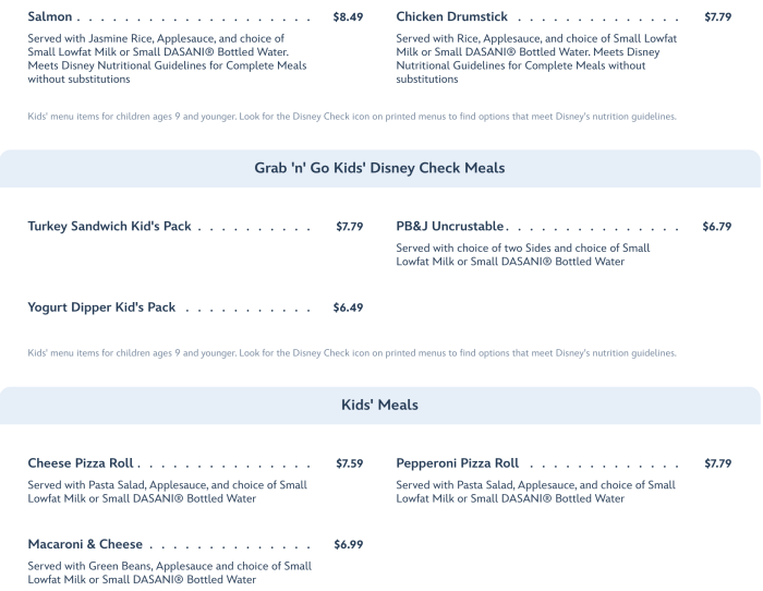 This restaurant is home to more kids’ meal options than some other places. You can order salmon, chicken, grab ‘n’ go meals, pizza rolls, or mac and cheese.