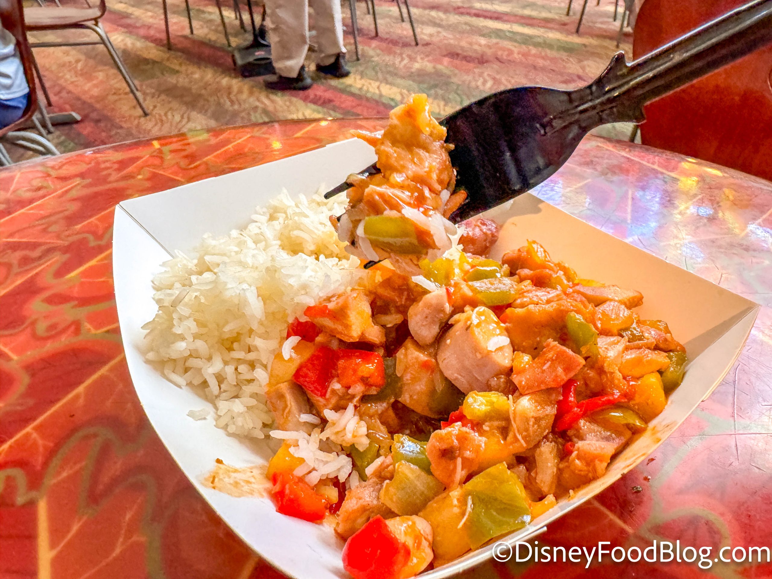 This dish smelled INCREDIBLE, so I was really excited to try it, but unfortunately, I was let down a bit. The rice was dry and crunchy in some places, but the sauce did have a nice mix of sweetness with a hint of spice. The chicken thighs were a little bit gristly and a smidge overcooked, which made them drier. The peppers and onions were also overcooked, making them mushy.