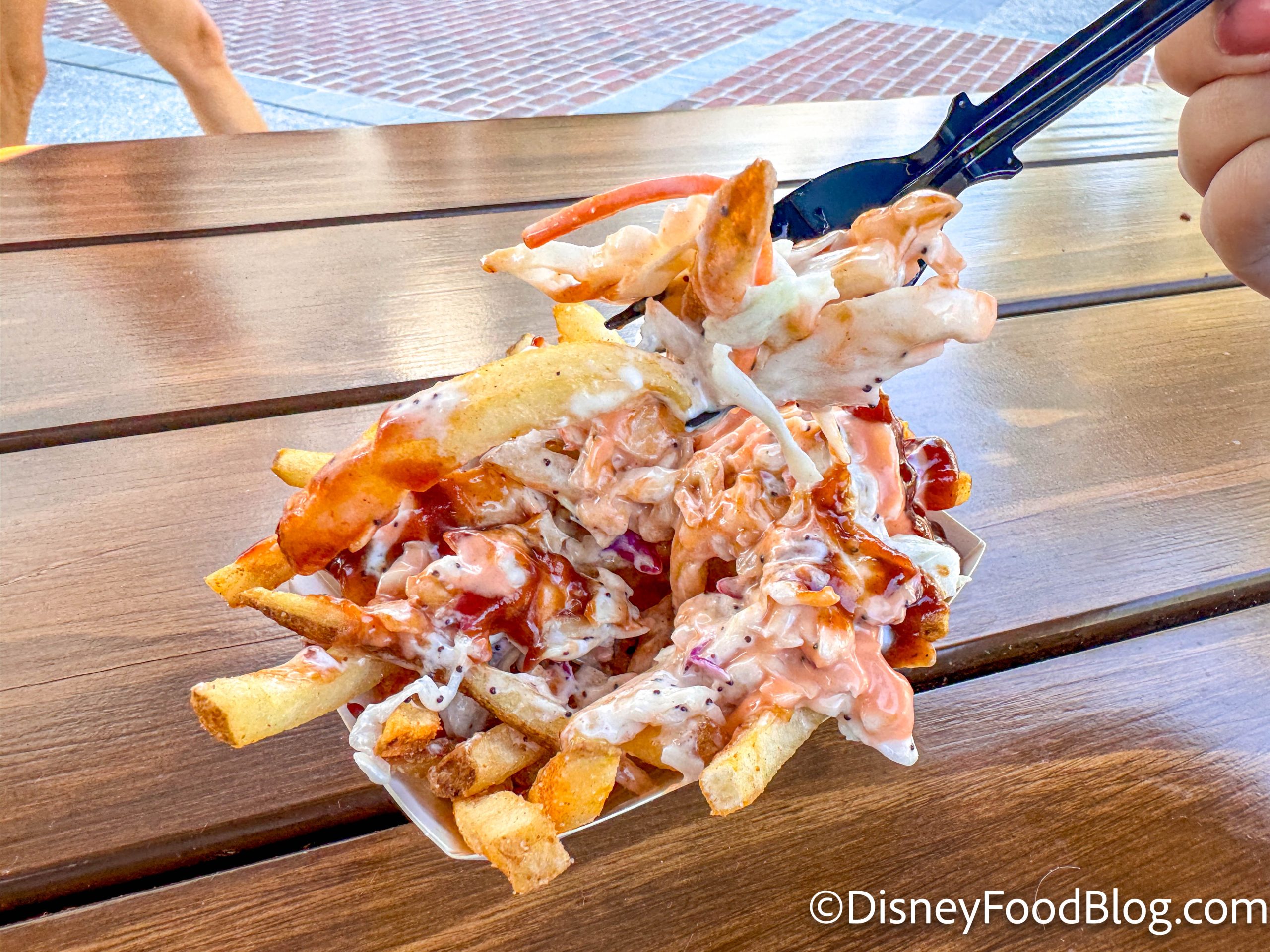 We started out by heading to Regal Eagle Smokehouse in EPCOT to grab the BBQ Fries. These are seasoned french fries topped with coleslaw, sweet BBQ sauce, and ketchup aioli for $6.49.