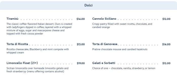 Of course, there are also some delicious dessert options including Tiramisù and Cannolo Siciliano.