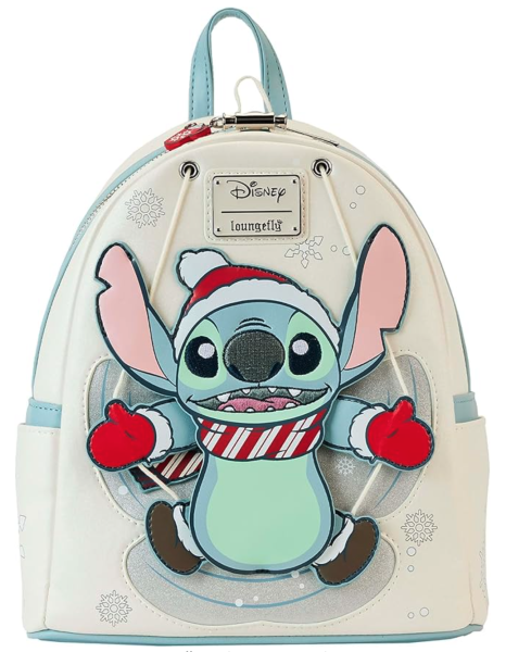 This Loungefly has a classic Christmas scene featuring Mickey, Minnie, Goofy, Dumbo, Peter Pan, Tinker Bell, Stitch, and more! You can’t go wrong with an all-around classic holiday backpack.