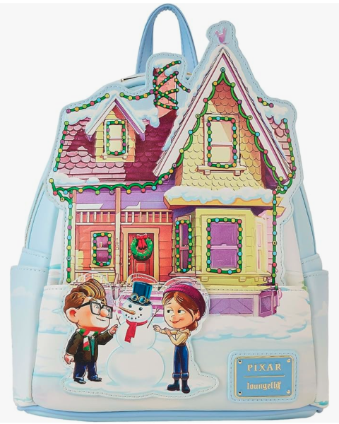 Carl and Ellie are the cutest couple ever (except maybe Mickey and Minnie). We love seeing them together enjoying the winter activities like building a snowman. The house is certainly looking festive on this backpack!