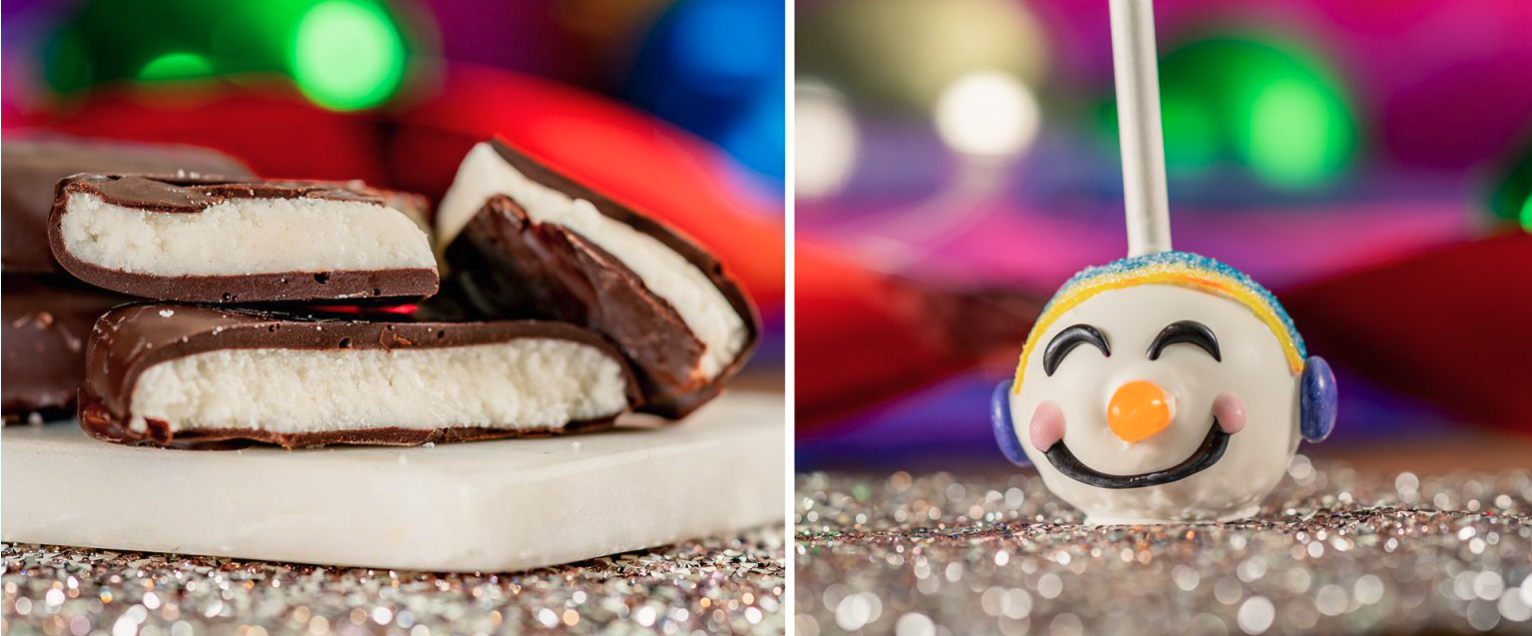 - Holiday Minnie Cake Pop: Peppermint-flavored Vanilla cake pop with two marshmallow ears dipped in red-colored white chocolate, drizzled with green-colored white chocolate, and embellished with a red, polka dot Minnie bow